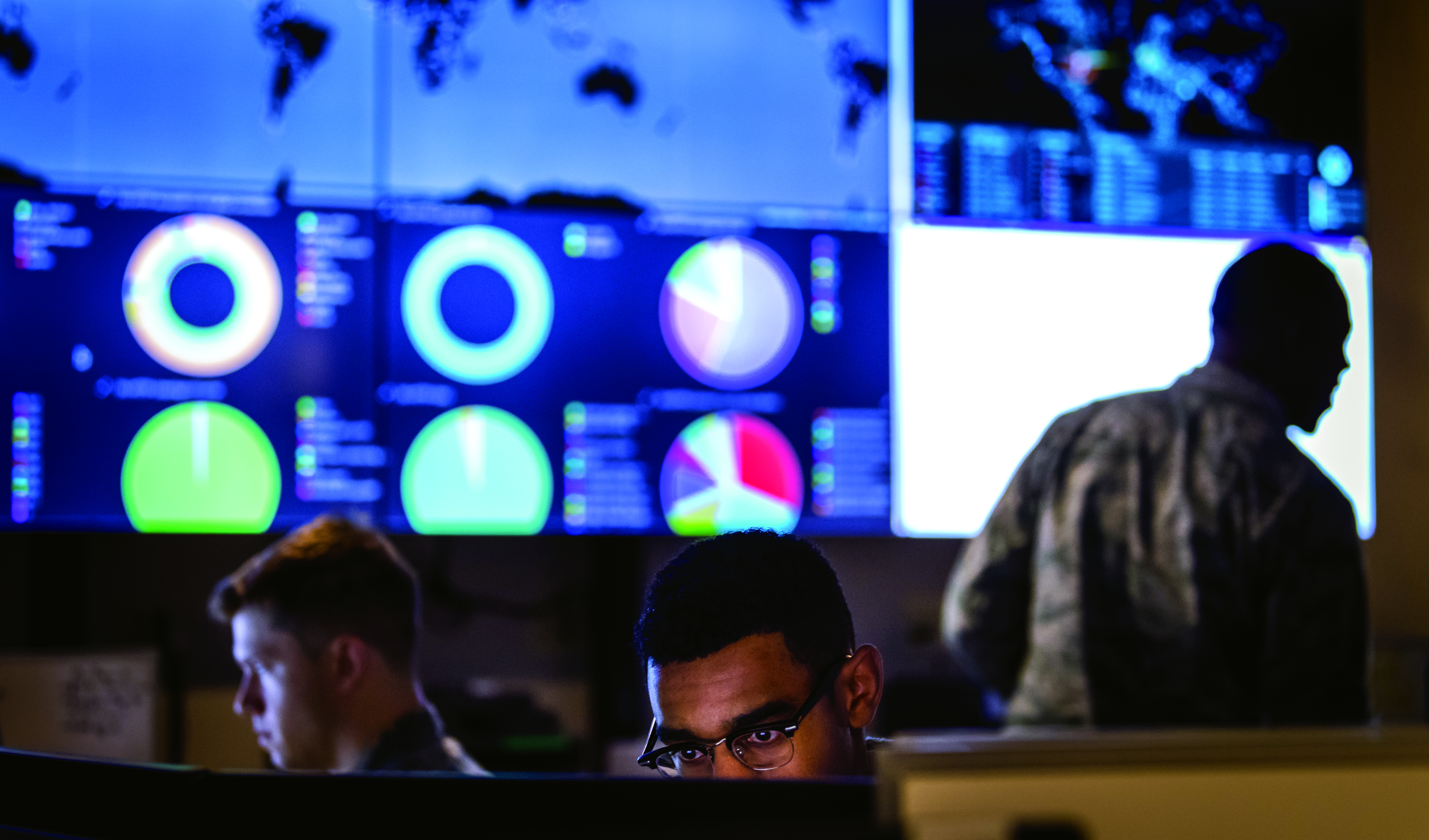 Cyber warfare operators assigned to the 275th Cyber Operations Squadron of the 175th Cyberspace Operations Group of the Maryland Air National Guard configure a threat intelligence feed for daily watch in the Hunter's Den at Warfield Air National Guard Base, Middle River, Md., Dec. 2, 2017. (U.S. Air Force photo by J.M. Eddins Jr.)
