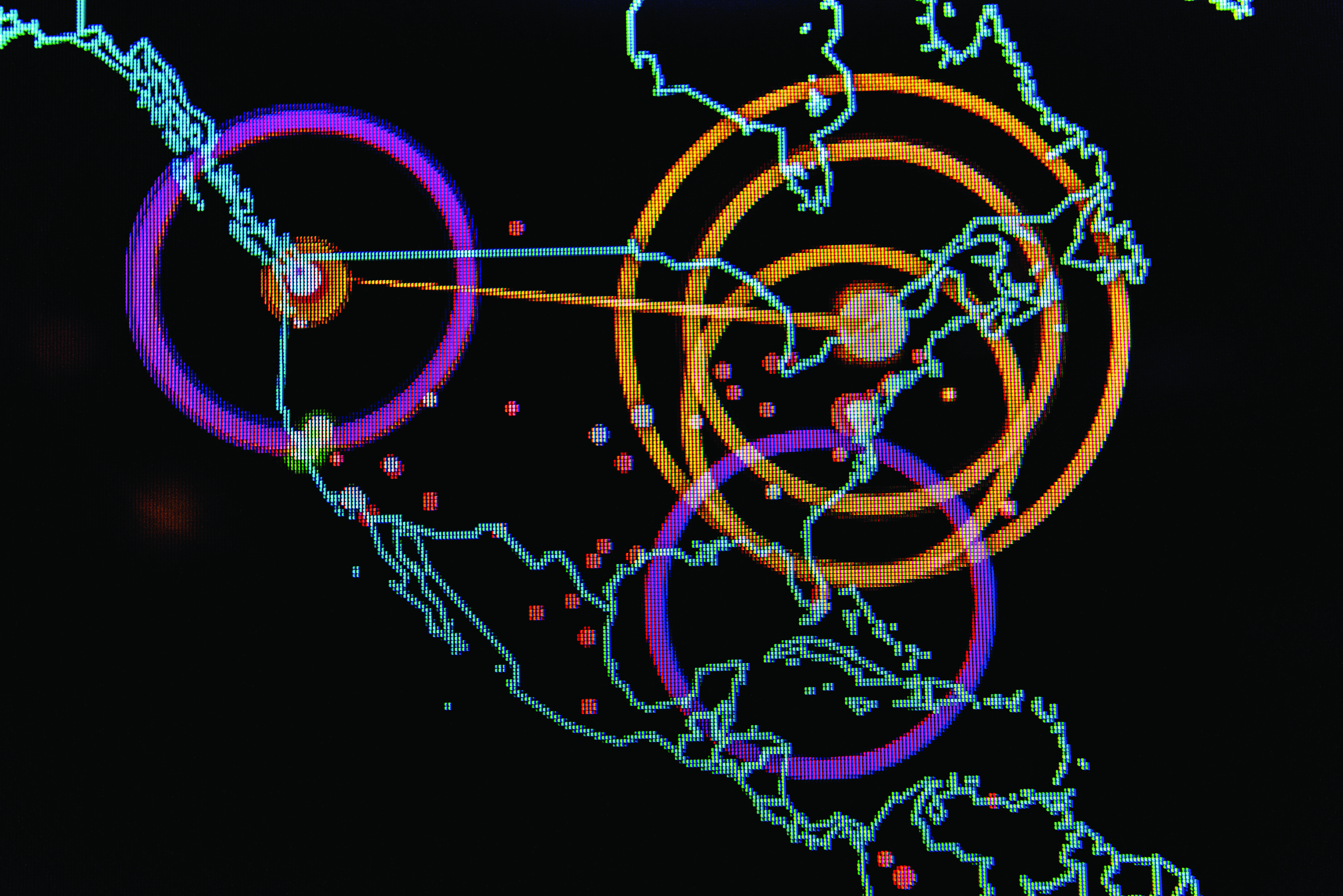 The Norse data wall on the operations floor of the 275th Cyber Operations Squadron, called the Hunter's Den, provides real time worldwide cyber attack sources and attack locations for the 175th Cyberspace Operations Group of the Maryland Air National Guard at Warfield Air National Guard Base, Middle River, Md., Dec. 2, 2017. This portion of the screen is focused on attacks within North America. (U.S. Air Force photo by J.M. Eddins Jr.)