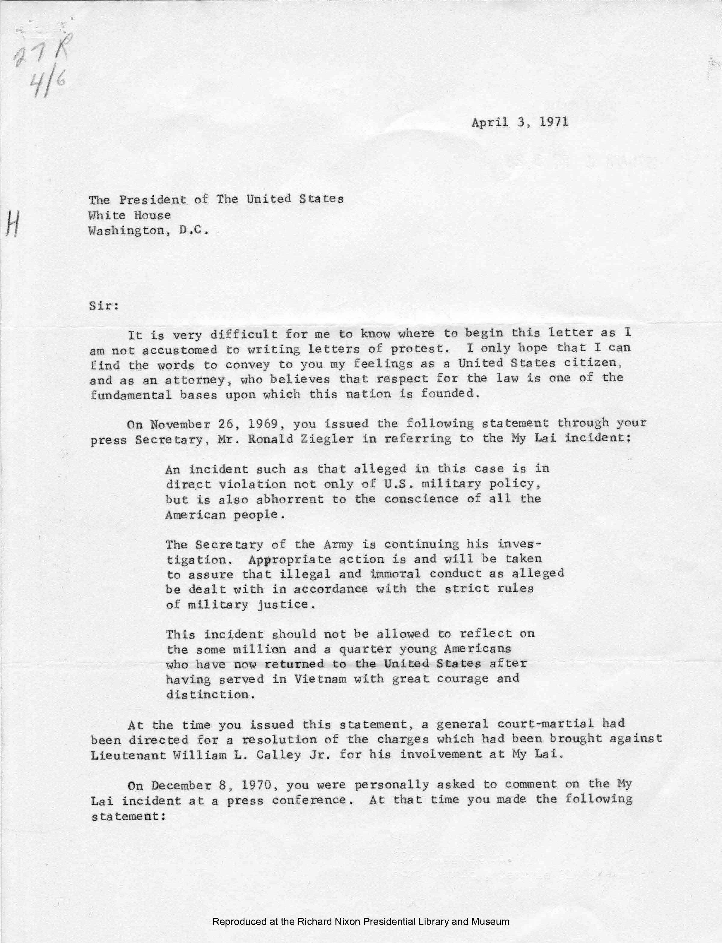 At the time, it was clear to almost everyone that President Nixon had interfered in the Calley case in response to angry letters, draft-board resignations, and public opinion polls showing that the vast majority of Americans viewed Lieutenant Calley either as a scapegoat or as a Soldier simply doing his duty. Daniel thought otherwise, and wrote to Nixon that it was shocking to him that “so many people across the nation have failed to see the moral issue which was involved in the trial of Lieutenant Calley—that it is unlawful for an American soldier to summarily execute unarmed and unresisting men, women, children, and babies.”
