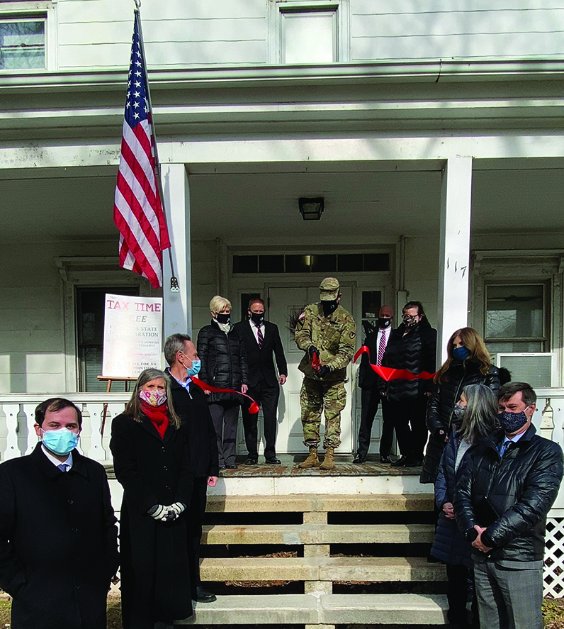 The Installation Legal Office (ILO) hosted the Fort Hamilton Tax Center Opening Ceremony on 25 January 2021. COL Craig Martin, USAG-FH Commander, cuts the ribbon while flanked by ILO personnel: Roderick O’Connor, Alma Whitelaw, Patricia Ingao, and Michael Huber. Four Fort Hamilton tax volunteers stand on the stairs. The two Adopt-A-Base tax attorneys (Mark Allison & Aaron Esman) are pictured in the forefront.