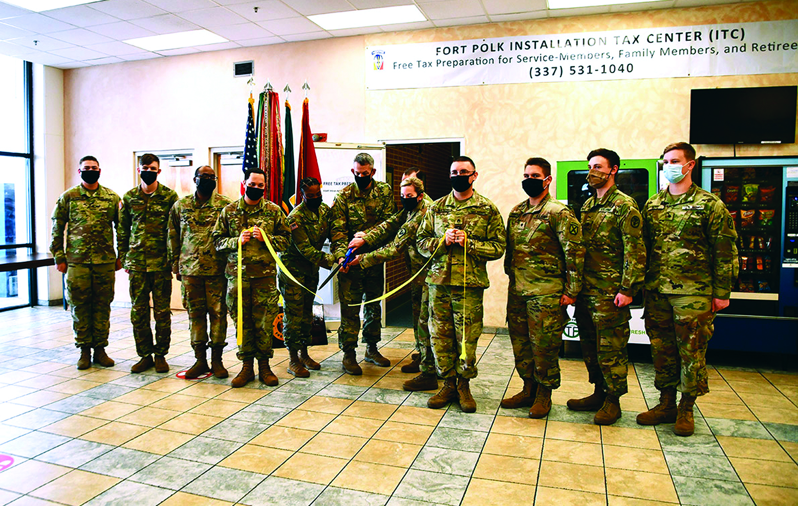 On 22 January 2021, the Joint Readiness Training Center and Fort Polk OSJA hosted the installation tax center ribbon-cutting ceremony. The Commanding General, BG David Doyle joined in celebrating the tax center being open for business. The ribbon was cut by the tax center OIC, CPT Jenekwa Harrison (left), the Commanding General, BG David Doyle (center), and the Staff Judge Advocate, COL Tiffany Chapman (right). Also pictured are Soldiers that will assist in preparing taxes this year, each representing a unit assigned to Fort Polk.