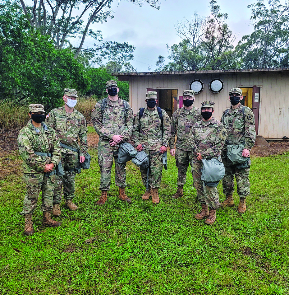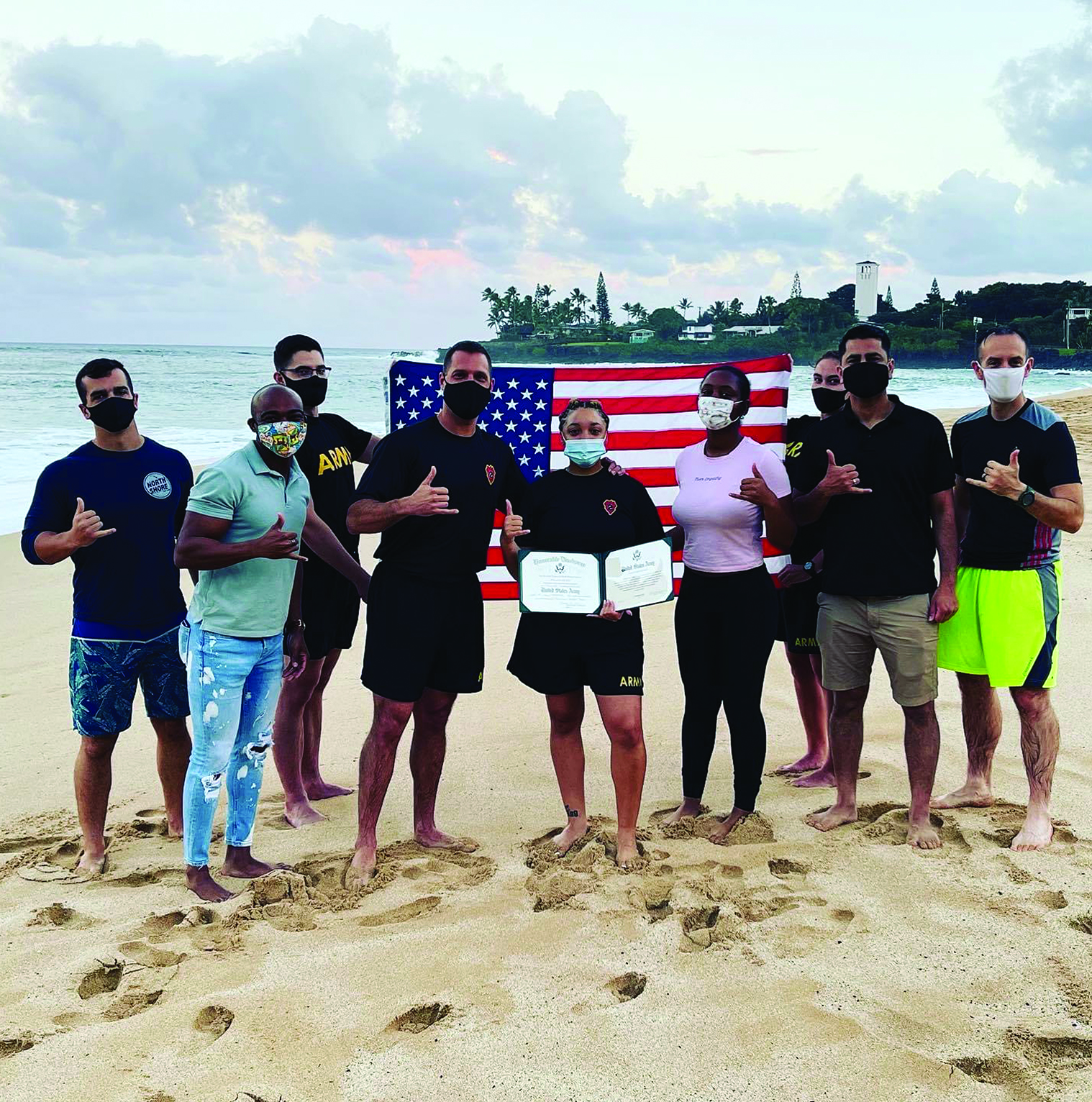 On 18 December 2020, SPC(P) Jinelis Solis, 2IBCT, 25th ID, reenlisted for three more years, including 12 months of stabilization in beautiful Hawaii. Members of the Warrior Brigade legal section and the HHC, 65th BEB commander came together at Waimea Bay for the occasion. Pictured from left to right: CPT John Ruhl, CPT LeBuria Johnson, SGT David Willey, MAJ Chris Chatelain, SPC(P) Jinelis Solis, SPC Lelia Contee, SGT Ashley Kiley, CPT Vick Jaswal, and SFC Thomas Coyne. Congratulations!