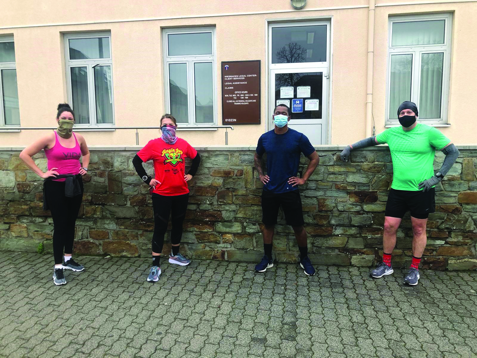 On 17 December 2020, members of the Client Services Division at USAREUR-AF participated in the Virtual 5k Jingle Bell Jog. Pictured from right to left: MAJ(P) Craig Ford, SGT Dawon David, Ms. Christine Hauser, and CPT Katherine Evangelista. Not pictured: CPT Avery Ory, who completed her 5k while on leave in Texas.