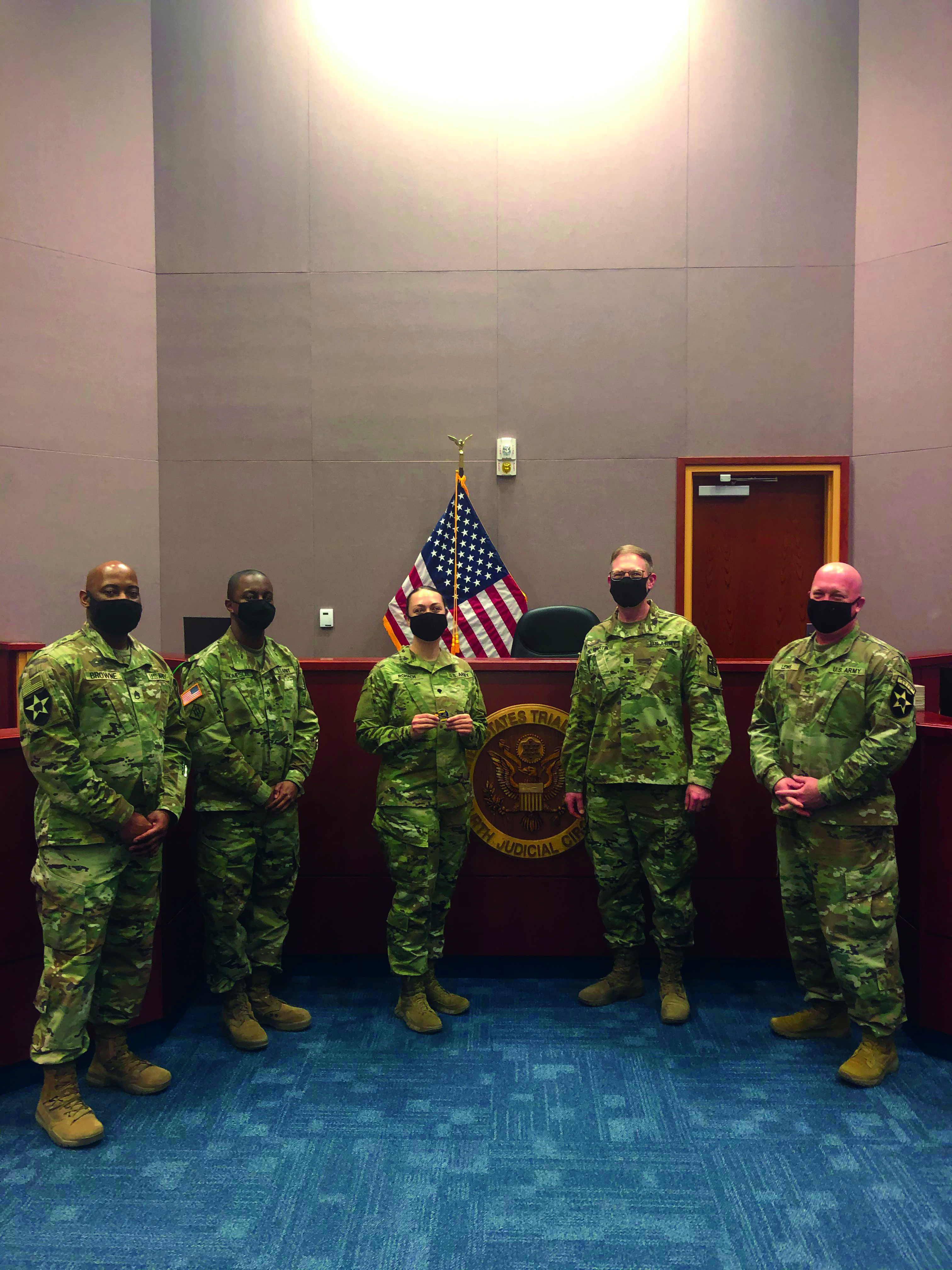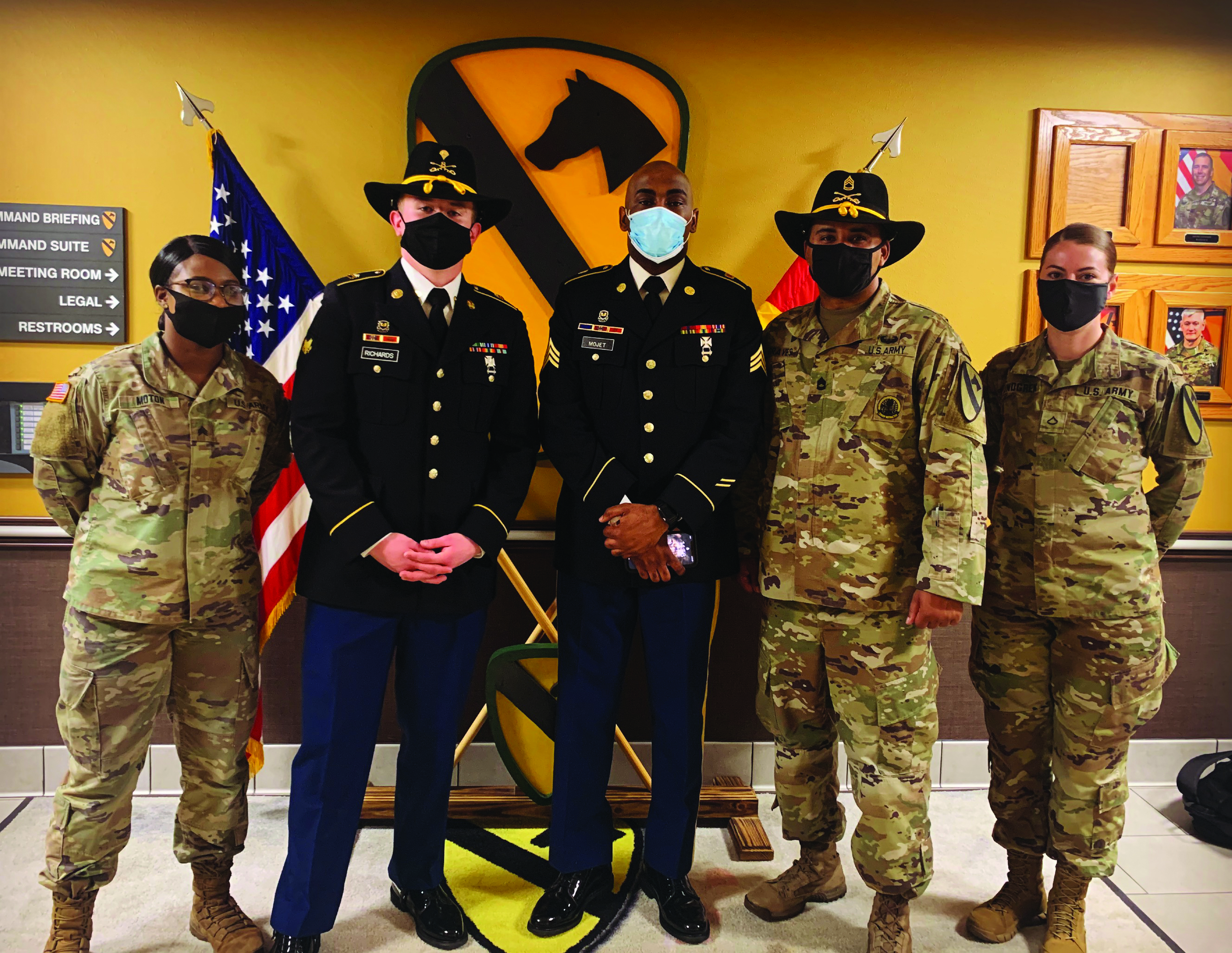 On 9 April 2021, SGT Mojet and SPC Richards continued the 2d Armored Brigade Combat Team, 1st Cavalry Division, tradition of winning, with both leaders winning the 1CD Paralegal NCO/Soldier-of-theQuarter Board. This is the second quarter in a row that 2ABCT has won both the NCO and Soldier category. Pictured from L to R: SGT Moton, SPC Richards, SGT Mojet, SFC Graves, and PFC Lindgren