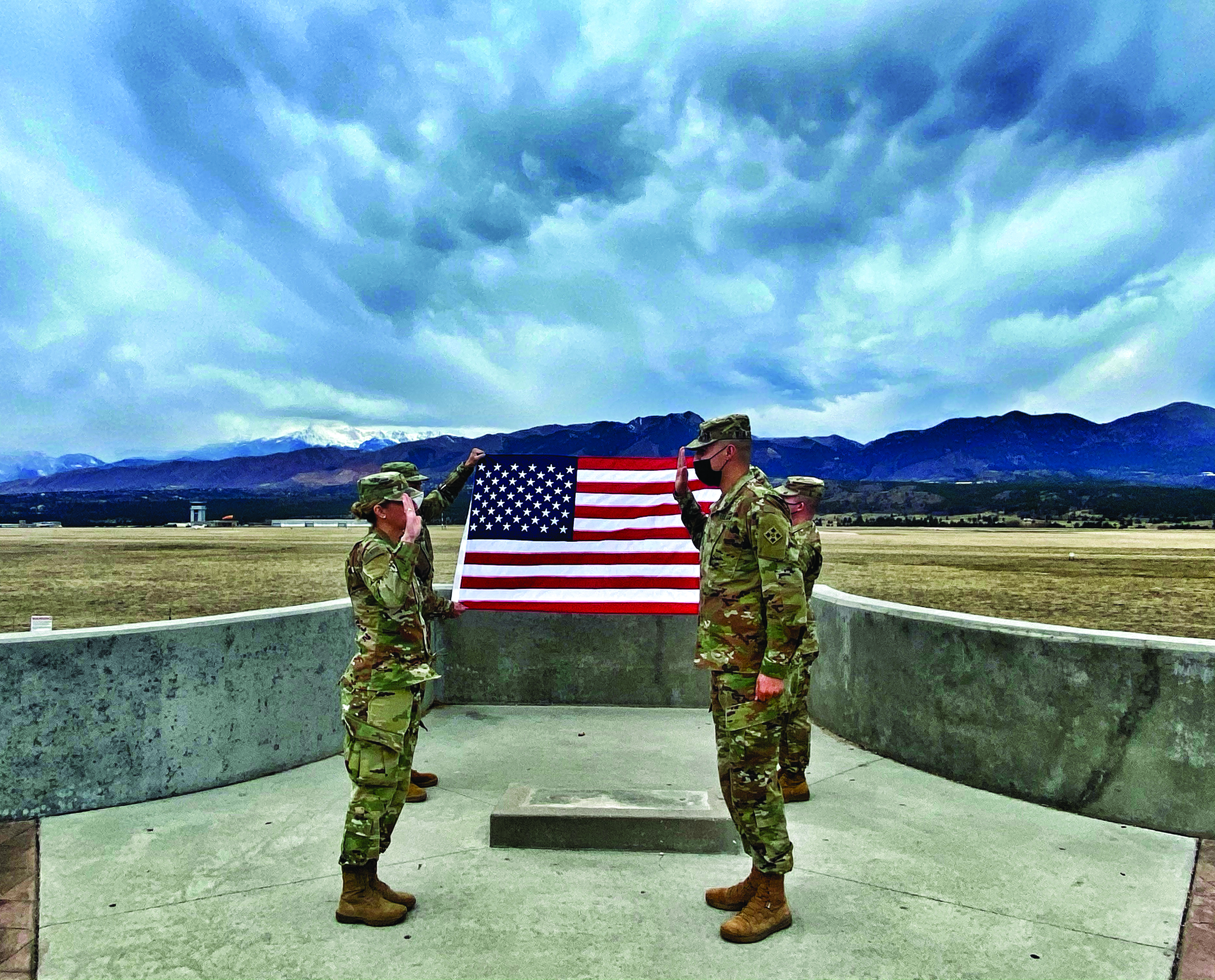 On 23 April 2021, SPC Jonathan Alvarado (right), of DIVARTY, 4th ID, re-enlisted for 4 years at the Air Force Academy Scenic Lookout. SPC Alvarado used his station-ofchoice re-enlistment option to go to Oahu, Hawaii. SPC Alvarado received the oath of enlistment from MAJ KJ Harris (left), DIVARTY, 4th ID, Brigade Judge Advocate.
