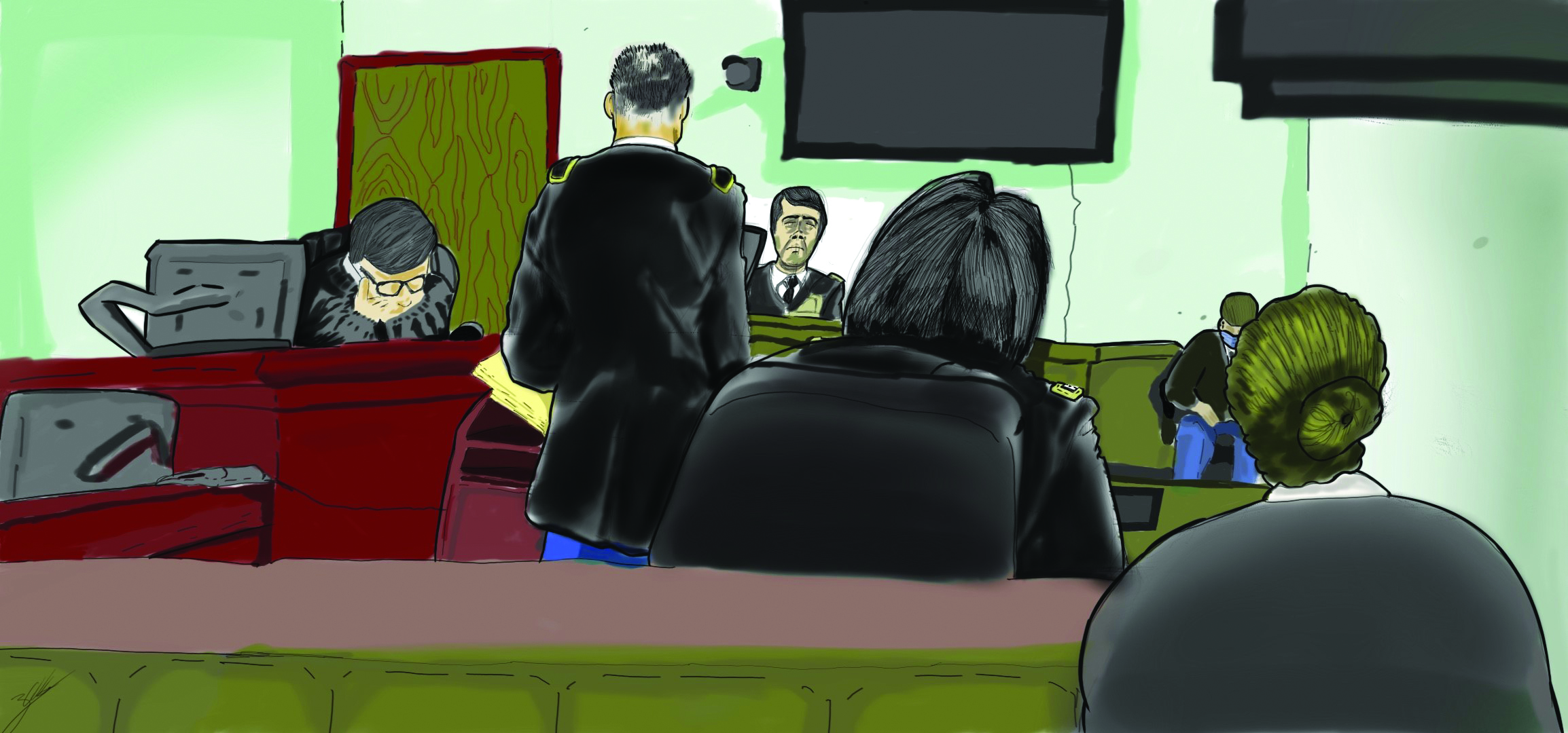 PFC Zanard Allison, 504th MI BDE, sketched a scene from a recent court-martial at Fort Hood, Texas. The SVP, LTC Cormac Smith, was cross-examining the accused while CPT Gabs Lucero looked on as second chair.