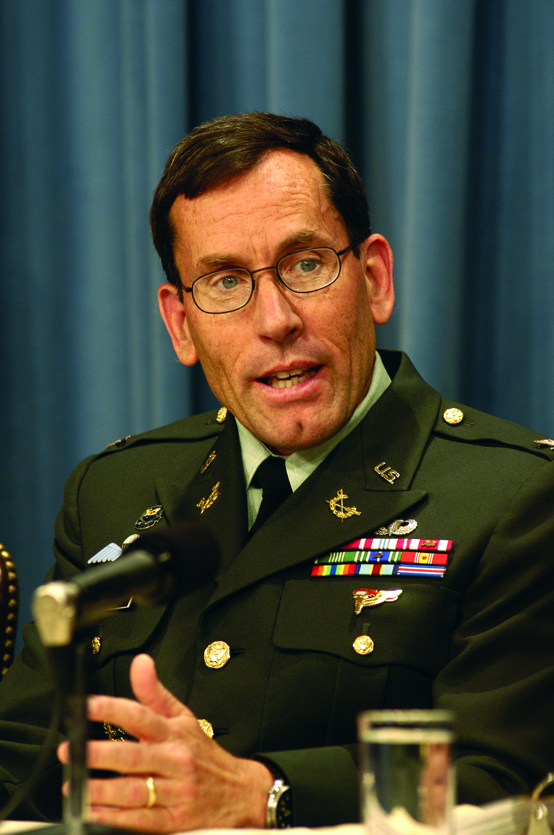 COL Borch participates in a press briefing regarding military commissions at the Pentagon in 2003. (Image courtesy of Fred L. Borch)