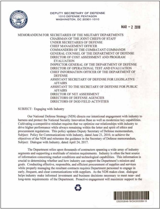 The OSC-I legal section’s coordination with SA ensures legal coverage and guidance when SA meets with U.S. industry, as well as when they correspond or interact with the GOI. It is important that judge advocates stay current with DoD guidance on interacting with U.S. industry. The Office of the Secretary of Defense periodically makes its intent known through publication of an official memorandum on engaging with industry.104 Knowing the implications of such memoranda will allow a judge advocate to give clear and direct guidance on what type of assistance and information is meant to be shared with industry representatives. Additionally, the “dos and don’ts” related to industry are laid out in the Security Assistance Manual and found in Appendix I of this article. Judge advocates assigned to the SCO mission should familiarize themselves with these left and right limits to properly advise, not only SA, but all of the members of OSC-I who come in contact with industry.