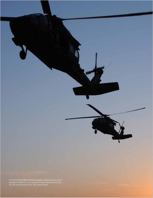 U.S. Army UH-60 Black Hawk helicopters prepare to pick up and transport Soldiers for an air assault mission near Samarra, Iraq (U.S. Air Force photo by Tech. Sgt. Molly Dzitko)