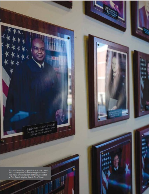 Photos of the chief judges of what is now called the U.S. Army Court of Criminal Appeals adorn a wall inside a meeting room at the court located at Fort Belvoir, Virginia. (Credit: Chris Tyree)