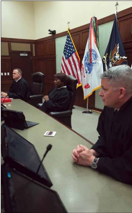Judges of the U.S. Army Court of Criminal Appeals participate in a mock hearing at Fort Belvoir, Virginia. (Credit: Chris Tyree)