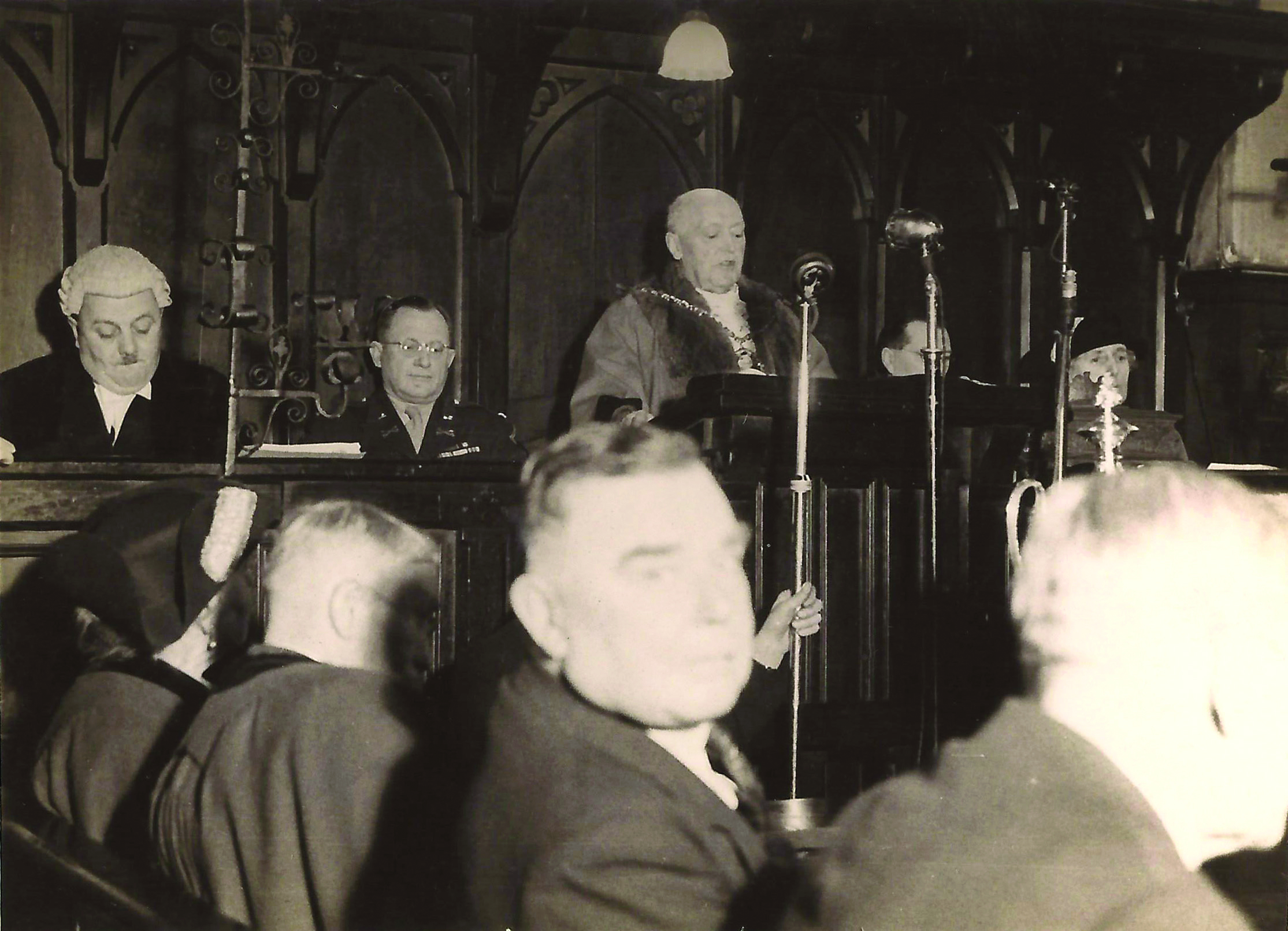 Colonel James E. Kilian, shown seated just left of the speaker at the podium. (Credit: National Archives)