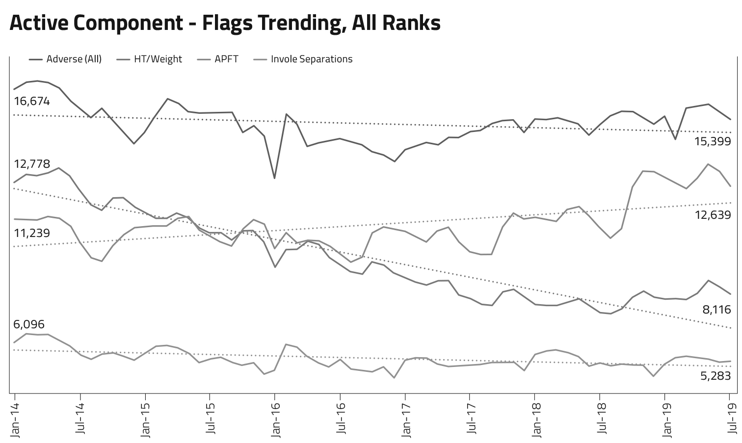 Although a Soldier may be subject to multiple flags for the same underlying issue, each flag requires a reason code and a report type code.11 Consider a Soldier who fails a random unit inspection urinalysis: as a general rule, this Soldier should be flagged using the AA (Adverse Action – Initial), BA (Involuntary Separation – Initial), and UA flag codes (Drug-Related Misconduct – Initial) code subtypes, assuming the commander intends to give the Soldier an Article 15 and initiate the separation process.
