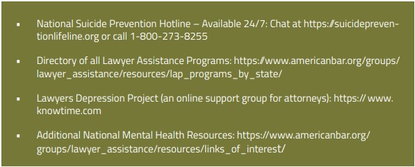 The entire Report of the National Task Force on Lawyer Well-being is a must-read. It provides a roadmap for improving the readiness of your organization through active engagement. A great place to start is the “Recommendations for All Stakeholders” section of the Report.23