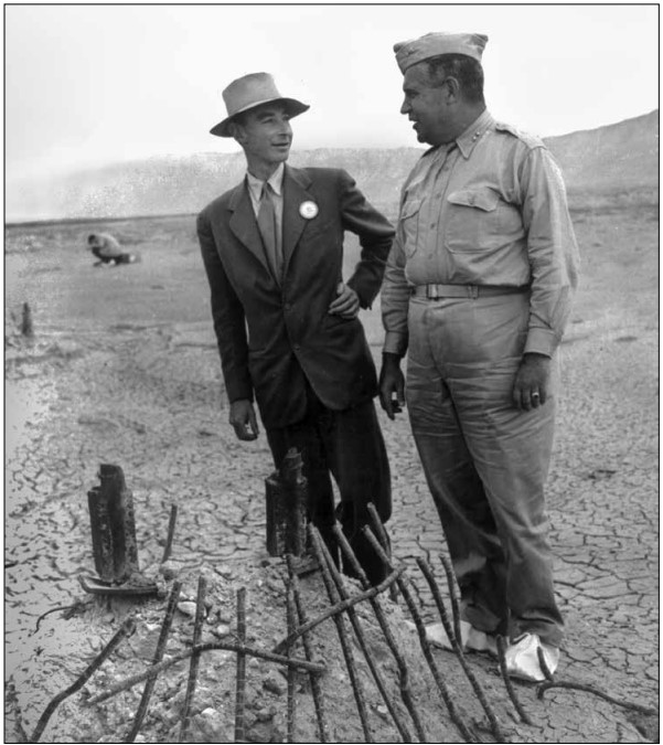 J. Robert Oppenheimer, left , credited with being the “father” of the atomic bomb, stands with then-Major General Leslie R. Groves at the Trinity test site in New Mexico. Groves was the director of the Manhattan Project. The Trinity test was the first test of an atomic bomb. (Courtesy: Atomic Heritage Foundation)