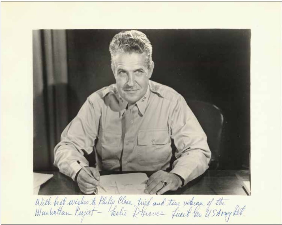 A signed photograph of General Leslie R. Groves. The inscription reads, “With best wishes to Philip Close, tried and true veteran of the Manhattan Project – Leslie R. Groves, Lieut Gen US Army Ret.” (Courtesy: Fred Borch, Regimental Historian)