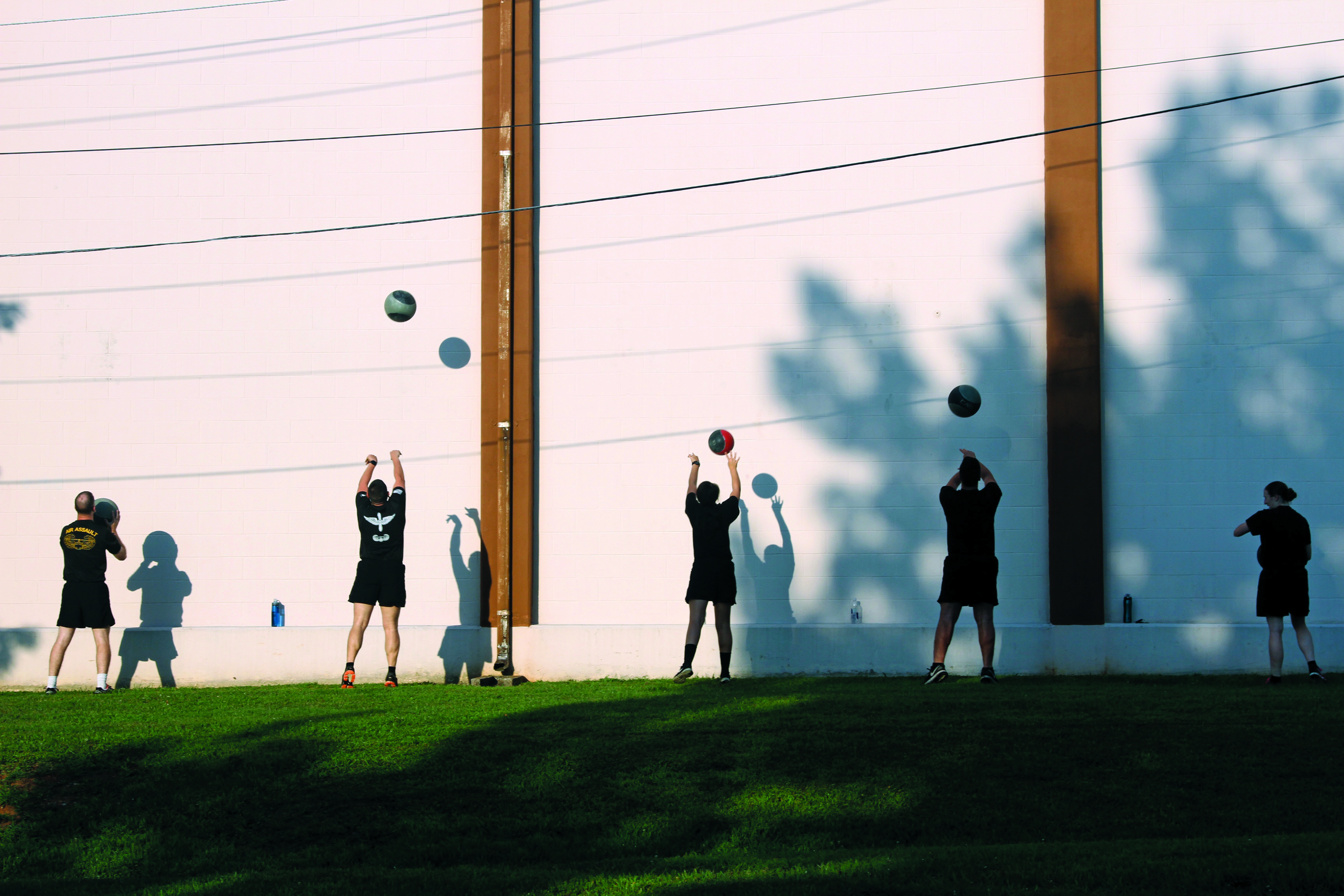 Soldiers at Fort Campbell, Kentucky, including members of the OSJA, conduct a wall ball exercise during circuit training behind the Olive Gym last year. The circuit training was designed to ready Soldiers for the upcoming Army Combat Fitness Test. (Credit: PFC Lynnwood Thomas, 40th Public Affairs Detachment)