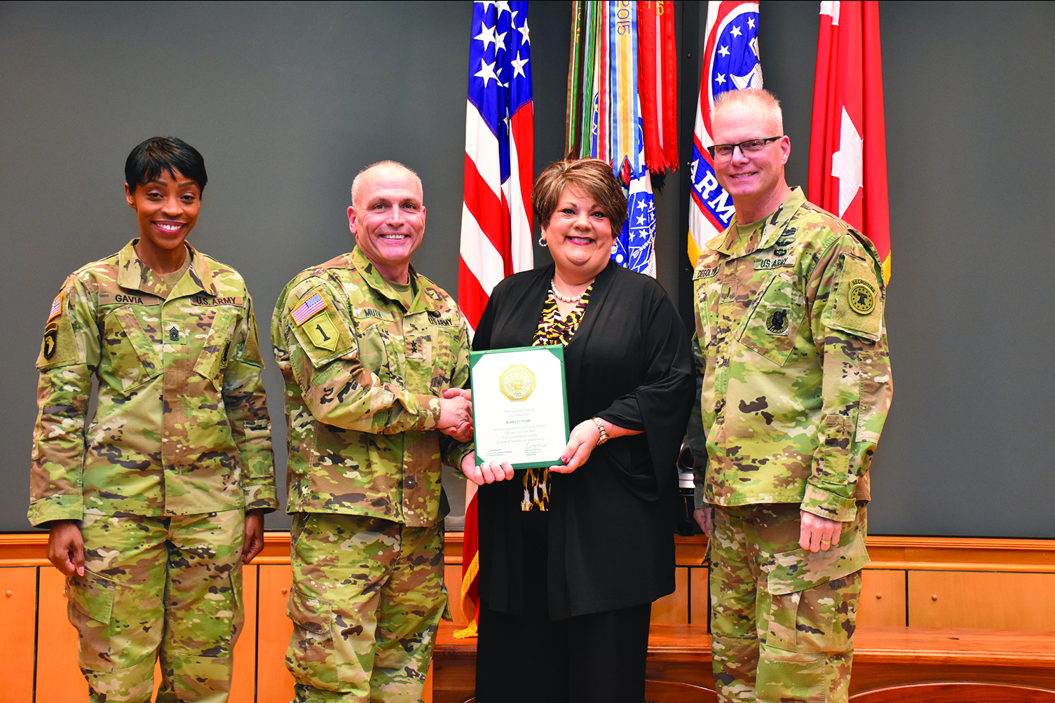 Photo 4: On 18 December 2019, the United States Army Recruiting Command Leadership (Major General Frank Muth, CW5 Troy DeGolyer, and CSM Tabitha Gavia), represented the command in publicly recognizing and thanking Ms. Kathy Veith for her forty years of service to the United States Army. Ms. Veith is a consummate professional and always brings a spark of joy to the office.