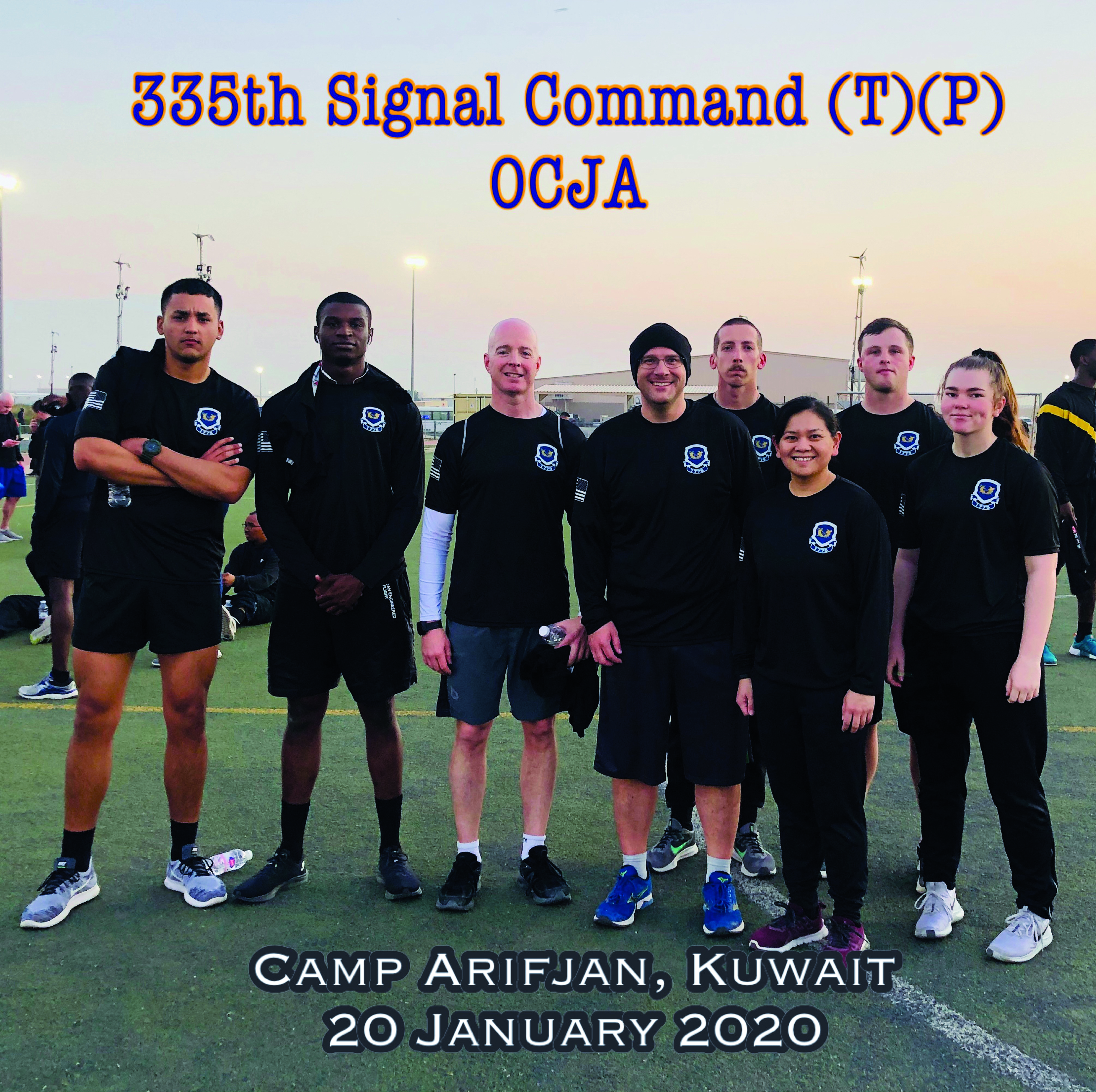 Photo 8: The 335th Signal Command (T)(P) Office of the Center Judge Advocate representing the Judge Advocate General’s Corps during the Martin Luther King Jr. 5k at Camp Arifjan, Kuwait. From left to right: SPC Kevin Rodriguez, PFC Kadeem Gadson, LTC Rod O’Connor, CPT Joseph Colston, PV2 Aaron Richard, SFC Pamela Ayaay, SPC Justin Vanwert, PV2 Logan Harrel.
